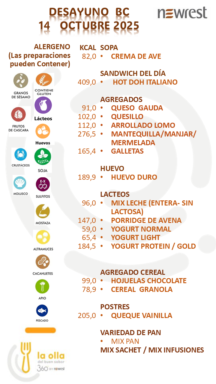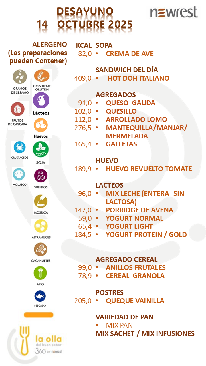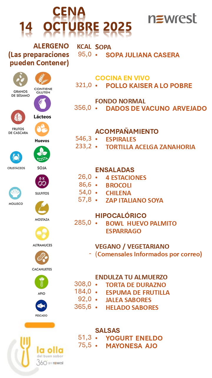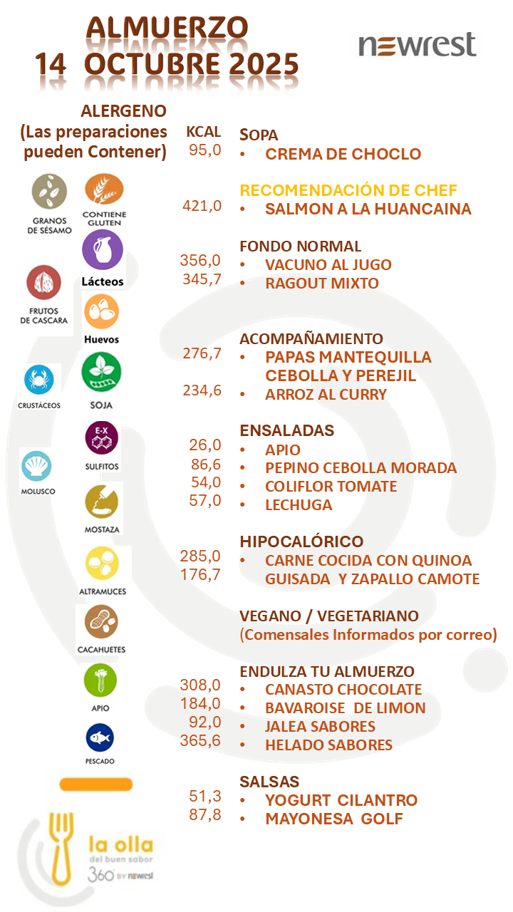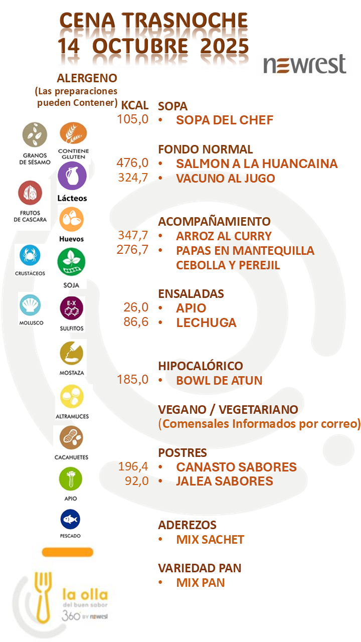 MENÚ DIARIODESCARGA EL MENÚ DE HOY MENÚ 13 OCTUBRE 2025 POSIBLES ALERGENOS ALIMENTARIOS NORMAS DE SEGURIDAD ALIMENTARIA INFORMATIVO Si no podemos operar de manera segura, no operamos.Nuestro propósitoCrear valor que perdure más allá de la minería